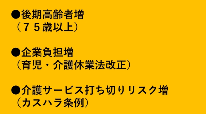 2025問題により後期高齢者が急増し定員制限や費用などの問題で老人ホームに入所できない方が増える恐れがあります。頼みの綱の訪問介護サービスも2024年の報酬改定で報酬が削減されたため介護士の減少に繋がる懸念があります。介護を必要とされる方の9割以上は70代以上の方です(厚生労働省「介護給付費等実態統計月報」/2024年4月調査分より)その方の子供の年齢は40~60代がメインです。この年代の方は企業にとって替えが効かない存在に達していると考えられます。部のエース社員、幹部社員、熟練技術者等の方です。この方たちが親の介護に専念するために会社を退職する「介護離職」や労働日数を減らす「長期の介護離脱」を選択する可能性があります。介護離職はもとより実は「長期の介護離脱」も問題です。介護はいつ終わるのか先が見えません。介護離脱中は業務に穴が生じます。替えが効かない従業員のため他の従業員からのフォローにも限界があります。一時的な派遣社員雇用で対応しようにもベテラン社員の代替は難しいです。同じ時期に2人目、3人目の介護離脱者が発生する可能性があります。